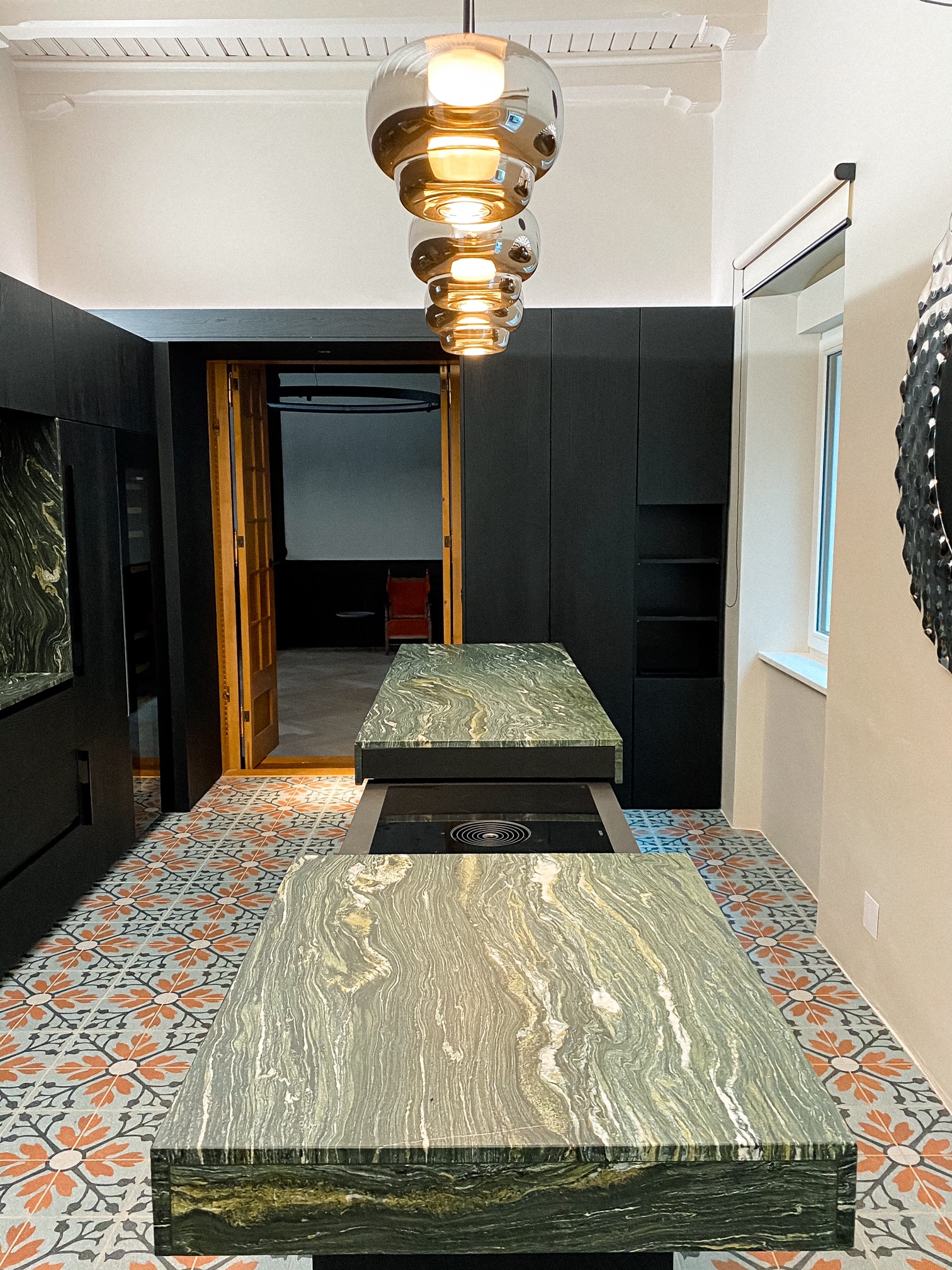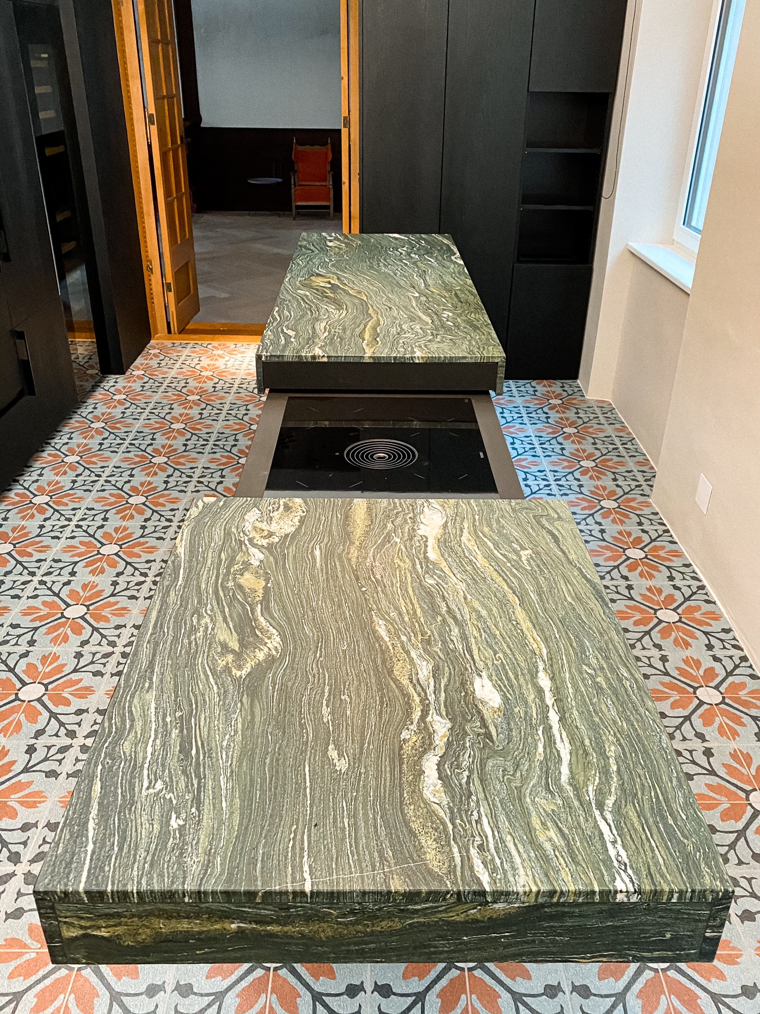 Ein Induktionskochfel von BORA Cooking Systems, das unter einer Natursteinarbeitsplatte verschwindet.